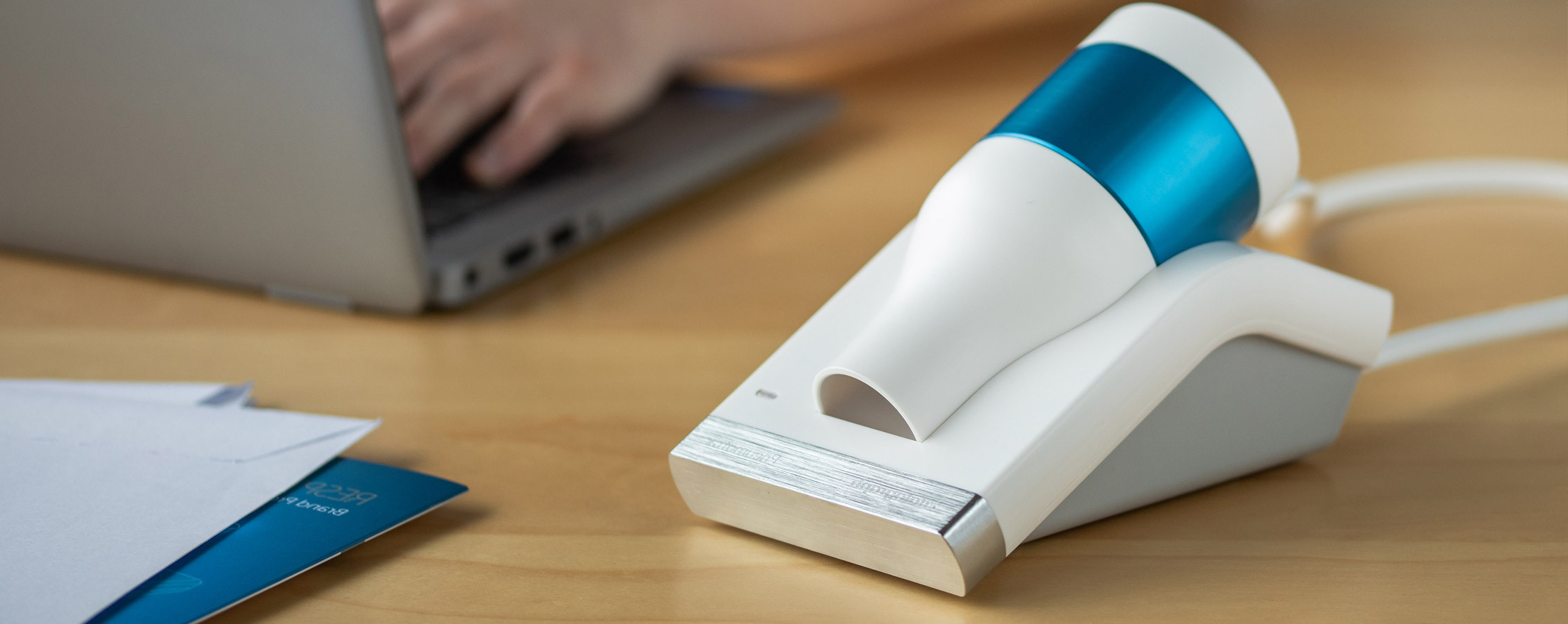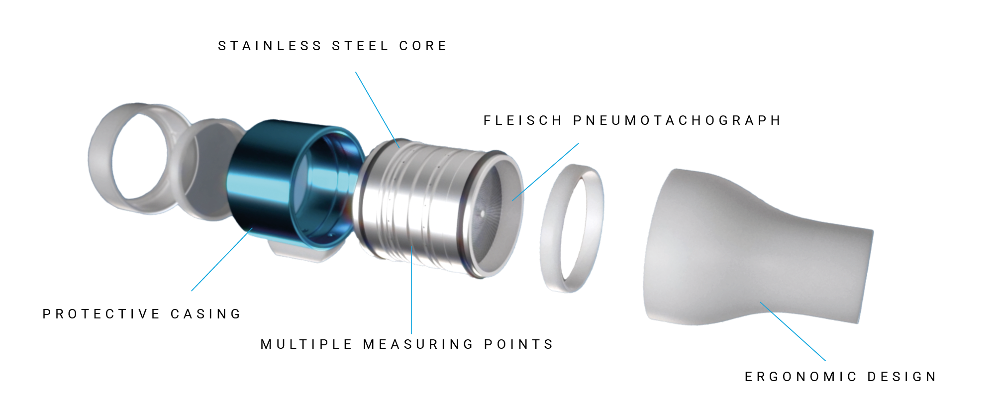 Zwei ringförmige Ringe mit mehreren Druckmesspunkten rund um den Fleisch-Pneumotachographen werden an einen Differenzdruckwandler mit niedrigem Bereich weitergeleitet. Dies ermöglicht die Erfassung der Durchflussdaten und führt zu einem wiederholbareren und genaueren Testergebnis.